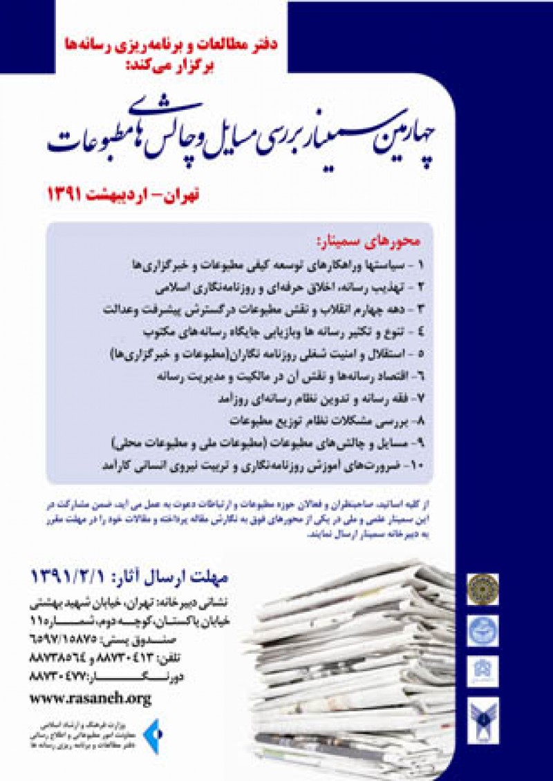 دفتر مطالعات و برنامهریزی رسانهها در آستانه برگزاری چهارمین سمینار بررسی مسایل و چالشهای مطبوعات از کلیه اساتید، صاحبنظران و فعالان حوزه مطبوعات و ارتباطات دعوت بهعمل میآورد ضمن مشارکت در این سمینار علمی و ملی در یکی از محورهای ذیل به نگارش مقاله پرداخته و مقالات خود را تا تاریخ 1/2/1391 به دبیرخانه سمینار ارسال نمایند.