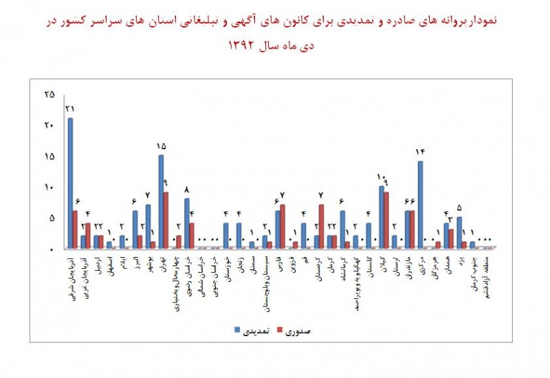 گفتی است تعداد مجوز های تمدیدی در هفته سوم دی ماه بیش از هفته های دیگر و شامل 42 مورد بوده است و در ارتباط با مجوزهای صادره نیز هفته اول دی ماه، بیشترین تعداد صدور مجوز را با 24 مورد دارا بوده است.