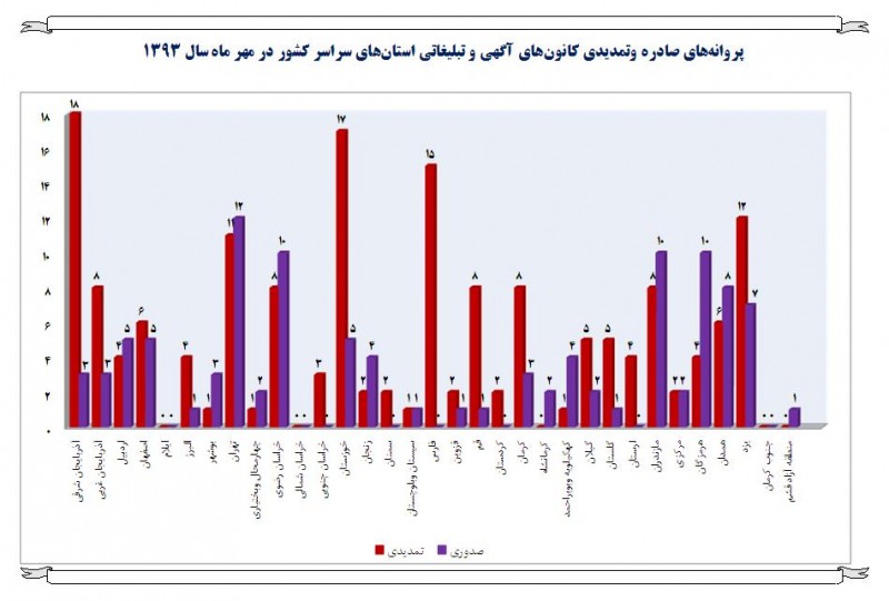 بر اساس گزارش مهرماه دفتر تبلیغات و اطلاعرسانی ، از میان 274 مجوز تمدید و صادر شده، 168 پروانه فعالیت، تمدید و 106 مجوز نیز برای کانونهای تازهتأسیس صادر شده است.