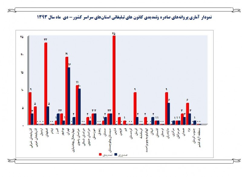 در نخستین ماه زمستان، استان فارس با تمدید مجوز 25 کانون آگهی و تبلیغاتی، بیشترین تعداد پروانه فعالیت تمدید را به ثبت رسانده است و همچنین بیشترین مجوز صدوری با 16 کانون آگهی و تبلیغاتی تازهتأسیس به استان تهران تعلق دارد.