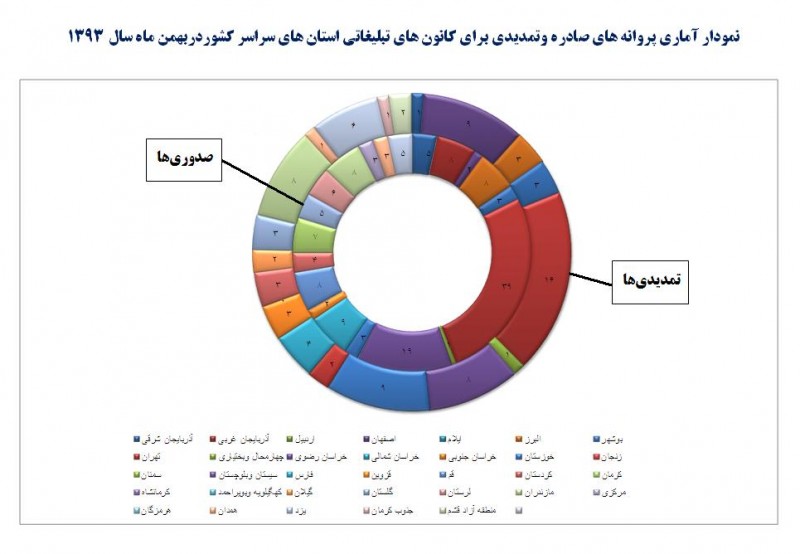 در بهمن ماه، پس از تهران بیشترین تعداد پروانههای فعالیت کانون آگهی و تبلیغاتی تمدید شده مربوط به استان خراسان رضوی و بیشترین تعداد پروانههای فعالیت صادرشده، در استان اصفهان به ثبت رسیده است. همچنین در 9 استان اردبیل، ایلام، خراسان شمالی، خراسان جنوبی، سمنان، سیستان و بلوچستان، کرمانشاه، کهگیلویه و بویراحمد و هرمزگان هیچ مجوزی صادر یا تمدید نشده است.