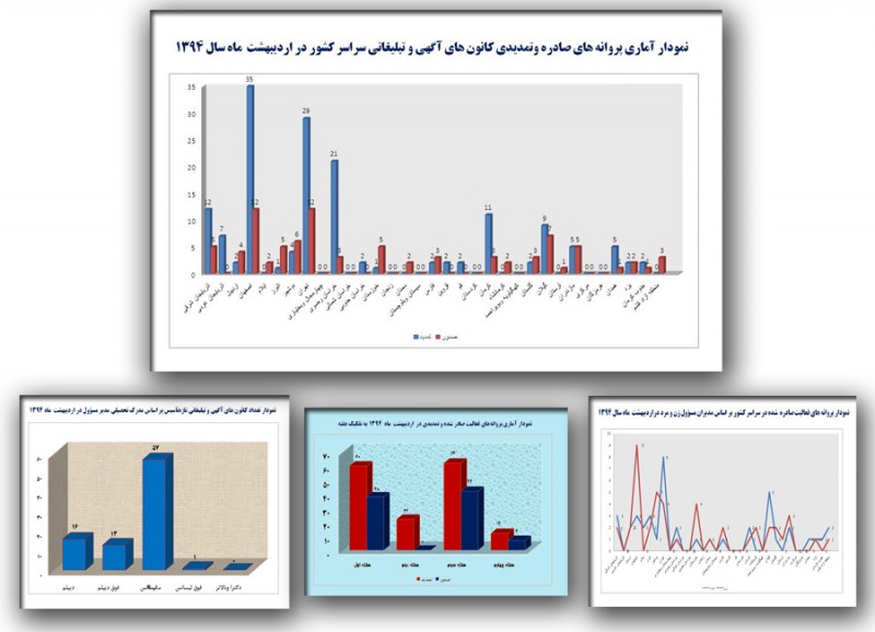 بر اساس گزارش اردیبهشتماه اداره کانونهای آگهی و تبلیغاتی دفتر تبلیغات و اطلاعرسانی، هماکنون تعداد کانونهای فعال در سراسر کشور به 8460 کانون رسیده است که از میان کانون های تازه تأسیس در اردیبهشت ماه، 45 مورد دارای مدیر مسؤول زن و 42 مورد دارای مدیر مسؤول مرد هستند.