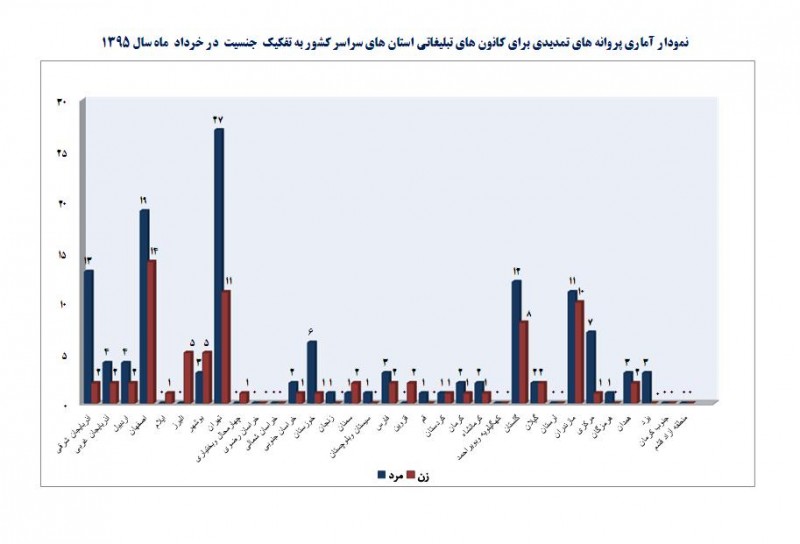 بر اساس گزارش آماری دفتر تبلیغات و اطلاعرسانی، در خردادماه، 206 مجوز کانون آگهی و تبلیغاتی تمدید و برای 90 کانون آگهی و تبلیغاتی تازهتأسیس، پروانه فعالیت صادر شد که 35 نفر از صاحبان امتیاز کانونهای تازهتأسیس را زنان و 55 نفر را مردان تشکیل دادهاند.
