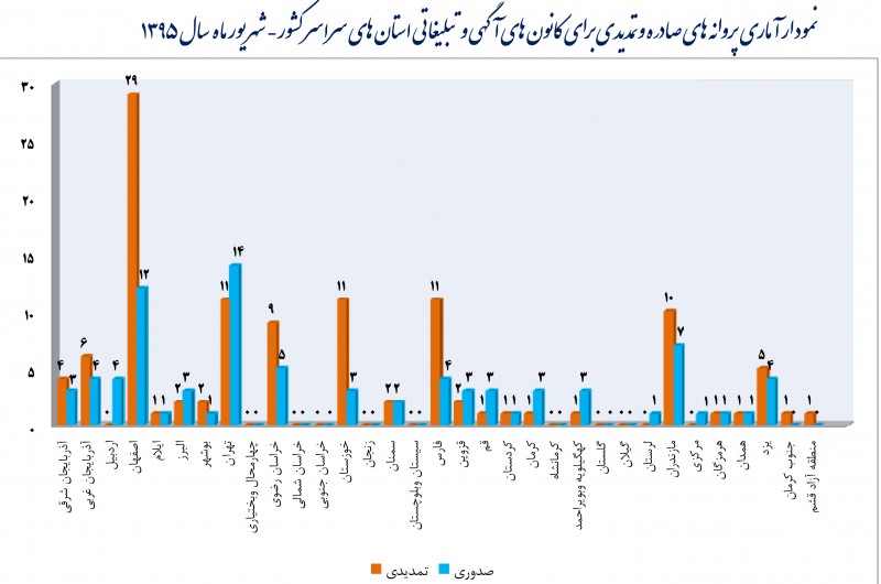 به گزارش پایگاه اطلاعرسانی دفتر تبلیغات و اطلاعرسانی، این دفتر در گزارشی یک ماهه، نمودارهایی آماری از نحوه صدور و تمدید پروانه فعالیت کانون آگهی و تبلیغاتی در استانهای کشور ارایه کرد که بر اساس آن، استان تهران بیشترین تعداد کانونهای دارای پروانه فعالیت تمدیدی و کانونهای تازهتأسیس را به خود اختصاص داده است. پس از استان تهران، استان اصفهان با صدور 12 مجوز و تمدید 29 پروانه فعالیت، استان مازندران با 7 مجوز صادرشده و 10 مجوز تمدیدی پروانه فعالیت کانون آگهی و تبلیغاتی بالاتر از سایر استانها در ثبت مجوزهای صدور و تمدیدی قرار دارند.