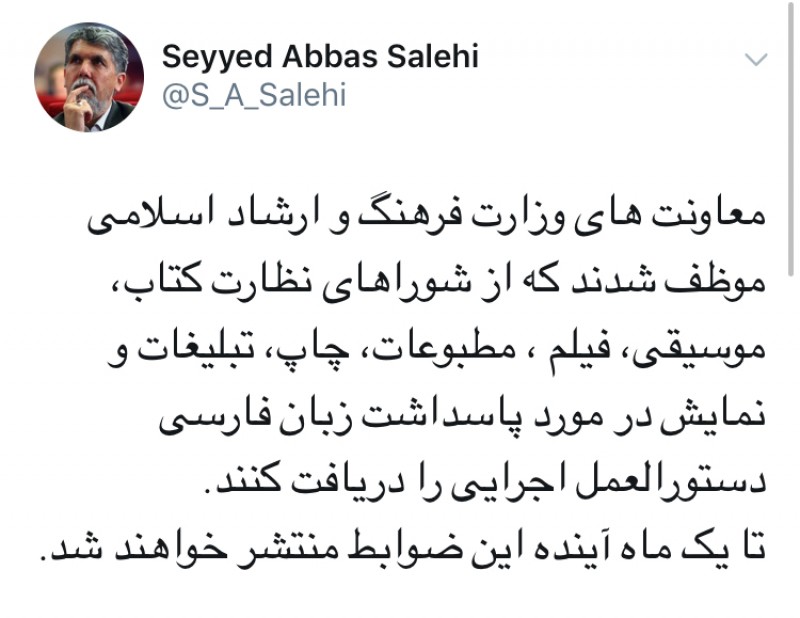 به گزارش مرکز روابط عمومی و اطلاعرسانی وزارت فرهنگ و ارشاد اسلامی، سید عباس صالحی در جدیدترین توئیت خود نوشت: