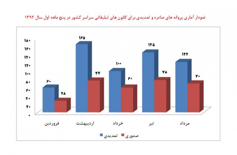 بر اساس نمودار 5 ماهه ارائه شده از سوی دفتر تبلیغات و اطلاع رسانی، صدور و تمدید مجوز کانونهای آگهی و تبلیغاتی در سراسر کشور در فروردین ماه 88 مورد، در اردیبهشت ماه 242 مورد، در خرداد ماه 160 مورد، در تیرماه 223 مورد و مرداد ماه 192 مورد در سراسر کشور اعلام شده است.