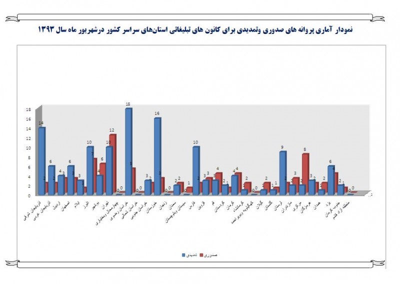 در آخرین ماه تابستان سال جاری مجوز 146 کانون آگهی و تبلیغاتی تمدید و برای 90 کانون آگهی و تبلیغاتی مجوز جدید صادر شد. در میان این مجوزها، 78 مجوز متعلق به متقاضیان زن (45 مجوز تمدید و 33 مجوز صدوری) و 158 مورد (101 مجوز تمدیدی و 57 مجوز صدوری) مربوط به متقاضیان مرد است.